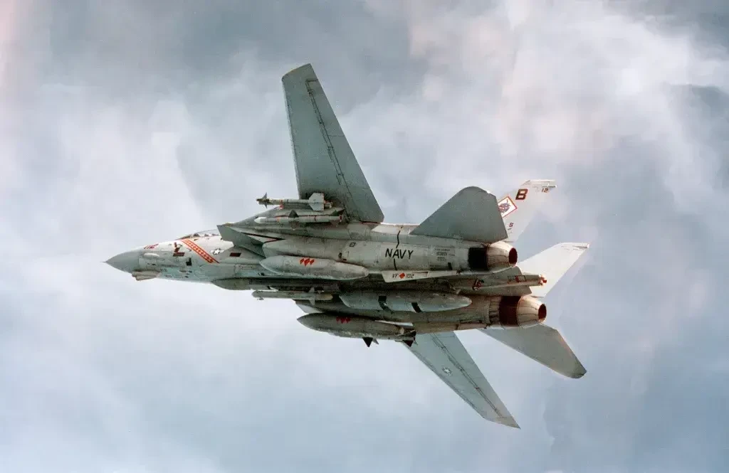 Истребитель F-14 ВМС США с подвесным контейнером AN/ALQ-167, а также другими боеприпасами и снаряжением во время вылета в поддержку операции «Южный дозор» в 1997 году