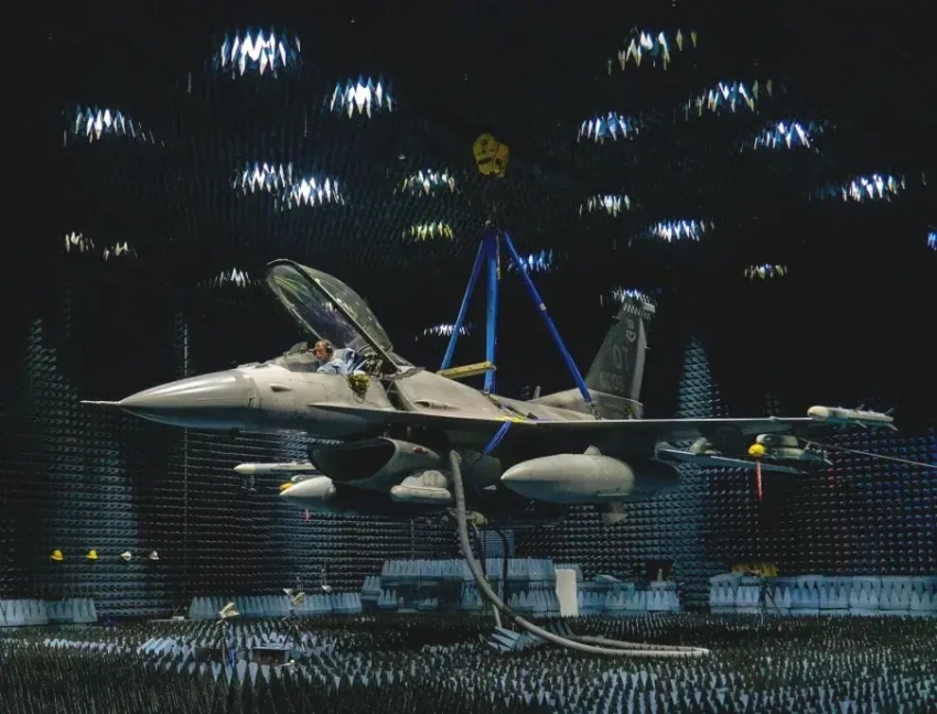 Фотография, на которой запечатлены испытания истребителя F-16 с подвесным контейнером Angry Kitten на центральной позиции в безэховой камере