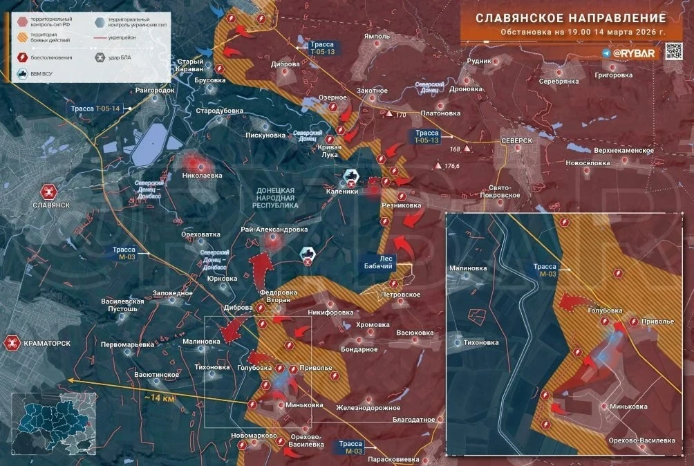 Наши войска взяли под контроль остатки Миньковки и закрепляются в Голубовке. Продвижение идет вдоль трассы М-03 прямо к Славянско-Краматорской агломерации. Хотя информация о форсировании канала у Малиновки пока не подтверждена, за месяц фронт здесь сместился на 5 км в глубину. Противник в Славянске уже начал эвакуацию инфраструктуры (троллейбусного парка) и строит «антидроновые тоннели».