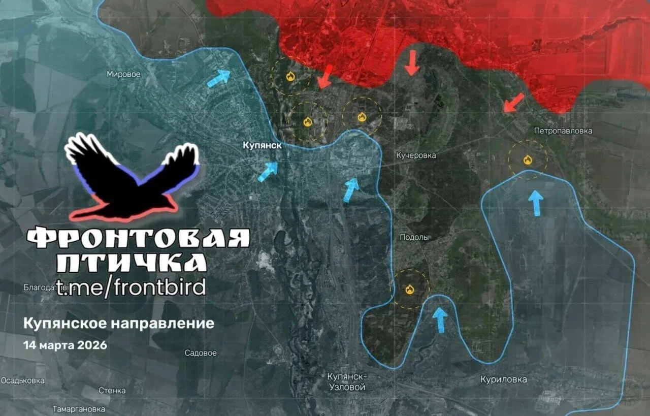 По информации Telegram-канала "Фронтовая птичка", на Купянском направлении 15 марта сохраняется сложная и динамичная обстановка, украинское командование пытается контратаковать с севера, стремясь оттеснить российские подразделения и изолировать их в центре города.