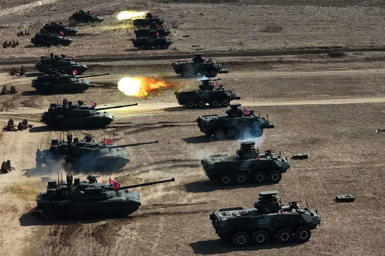 Как сообщает Центральное телеграфное агентство Кореи, на учениях военные КНДР продемонстрировали работу новой системы защиты танка, которая, как утверждается, способна успешно перехватывать ракеты и дроны. В ходе учений отрабатывались совместные действия при наступлении: наносились удары по укрепрайонам, прорывалась оборона, проводилась атака с использованием бронетехники.