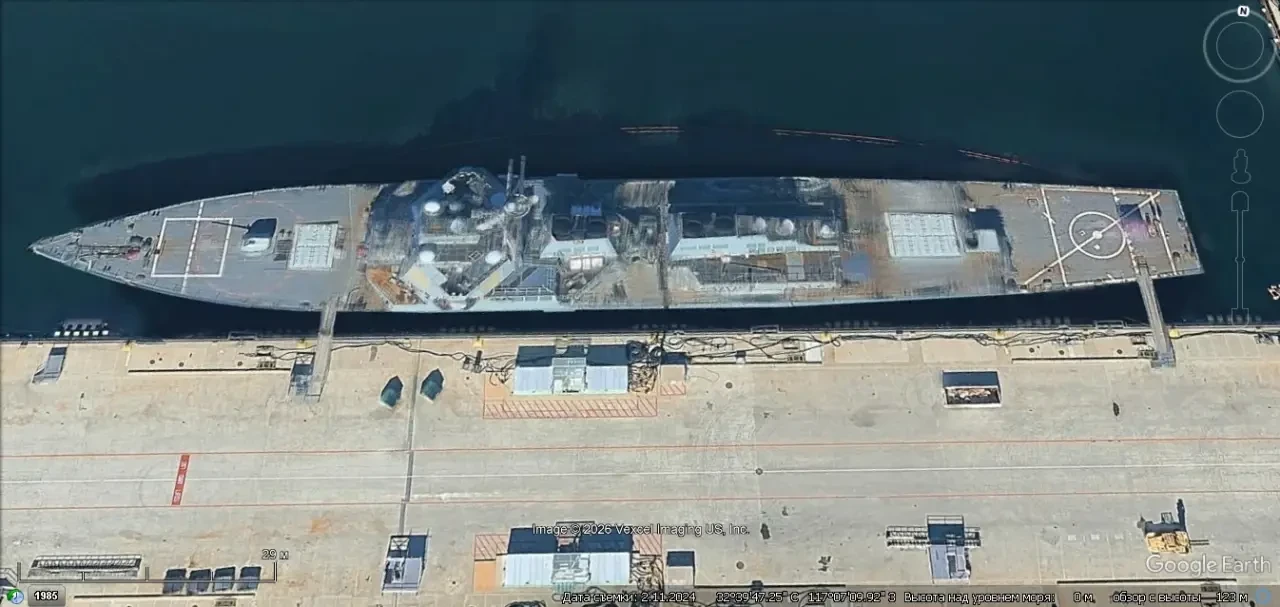 Спутниковый снимок Google Earth: эсминец типа «Aрли Бёрк» у пирса военно-морской базы Сан-Диего. Снимок сделан в феврале 2024 года