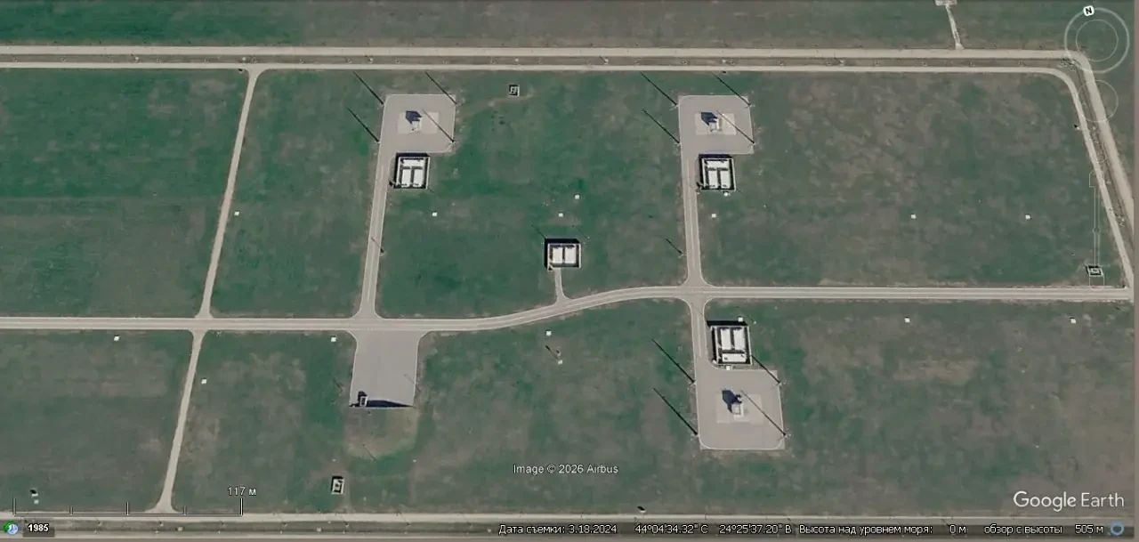 Спутниковый снимок Google Earth: пусковые установки противоракет SM-3 на авиабазе Девеселу. Снимок сделан в марте 2024 года