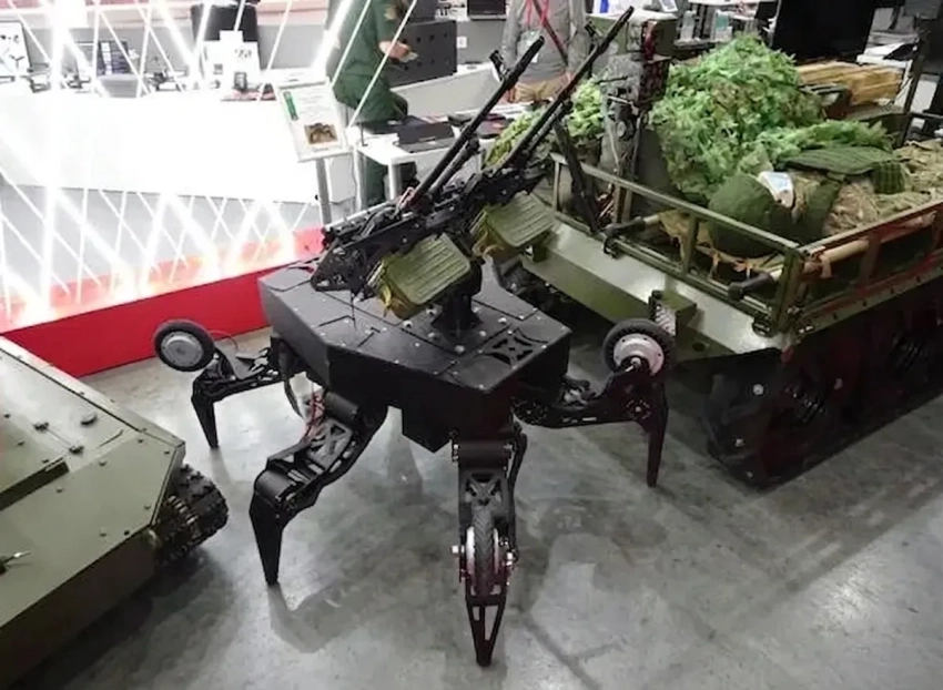 Компания "Прикладная робототехника" представила несколько проектов робособак, оснащенных пулеметным и гранатометным вооружением, а также оптико-электронными станциями разведки. На форуме "Армия-2024" был показан комбинированный робот "Паук" с шестью ногами и колесным движителем, вооруженный двумя пулеметами ПКТМ.