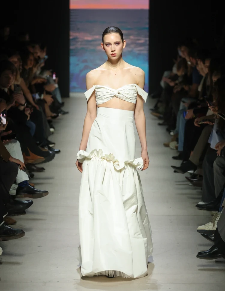 Команда молодых дизайнеров из Sergey Sysoev fashion school превратила подиум в картинную галерею. Модели в пышных платьях с кринолинами неспешно передвигались вдоль холстов с произведениями великих художников, в том числе Леонардо да Винчи и Микеланджело.