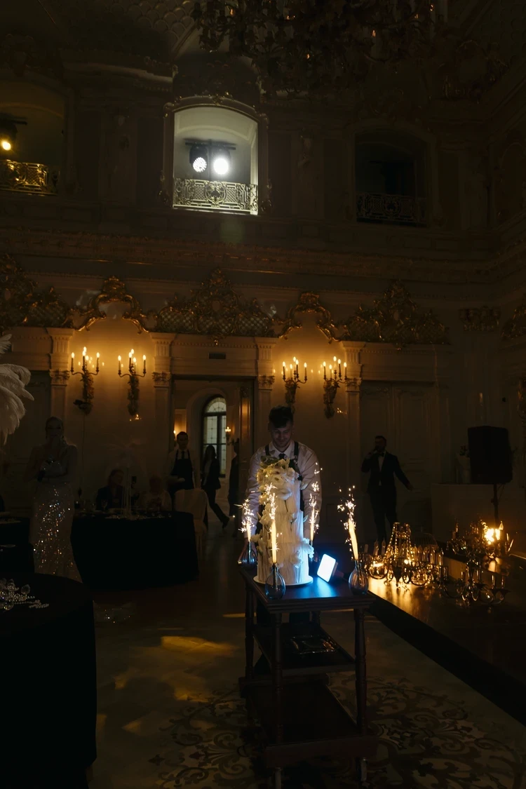 - Свадьба вдохновлена стилем ревущих 1920-х. Динамичность развития этой эпохи отражается в каждой детали свадьбы: в музыке, еде и декоре. На один день особняк Мясникова вернулся в прошлое, в котором тесно переплетаются стиль ар-деко и джаз. Концепцию оформления торжества претворили в жизнь декораторы из Петербурга. Обилие жемчужин, кристаллов, тонкой материи - отражение урбанистического направления эпохи, которое сочеталось с антикварным серебром, канделябрами и золотом парадных залов. Романтическую атмосферу праздника создали живые цветы, - поделилась с «КП-Петербург» организатор свадьбы Екатерина Сафронова.
