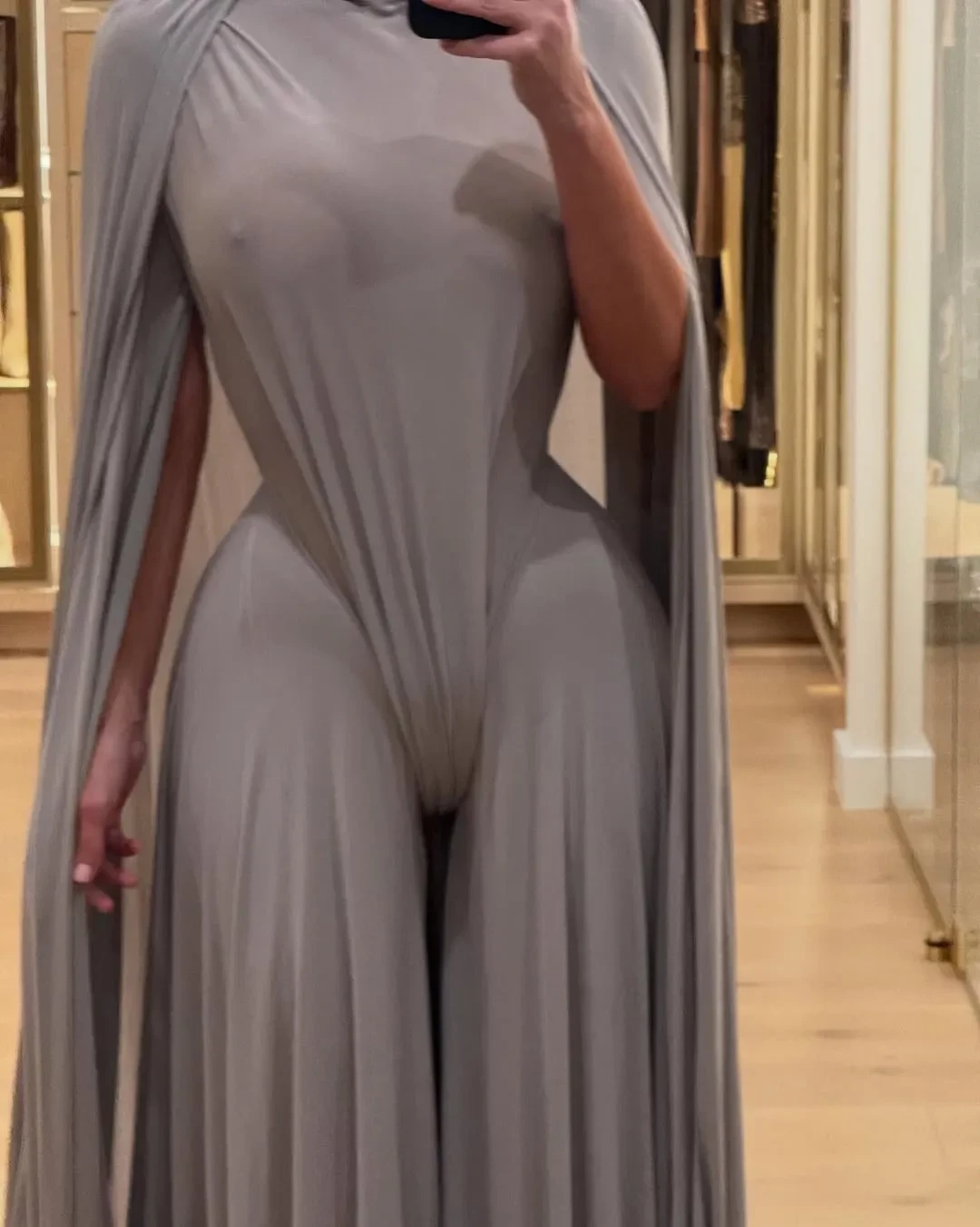 Дело в том, что 44-летняя телезвезда посетила премию в необычном сером наряде из дебютной кутюрной коллекции Гленна Мартенса для Maison Margiela. Драпированное платье-комбинезон отличается необычным силуэтом и тем, что предполагает отсутствие нижнего белья. Кардашьян, впрочем, не стала излишне эпатировать публику и надела под наряд бельё — непосредственно на мероприятие. Но и на голое тело комбинезон она также примерила и сделала селфи, которое опубликовала в своих соцсетях.