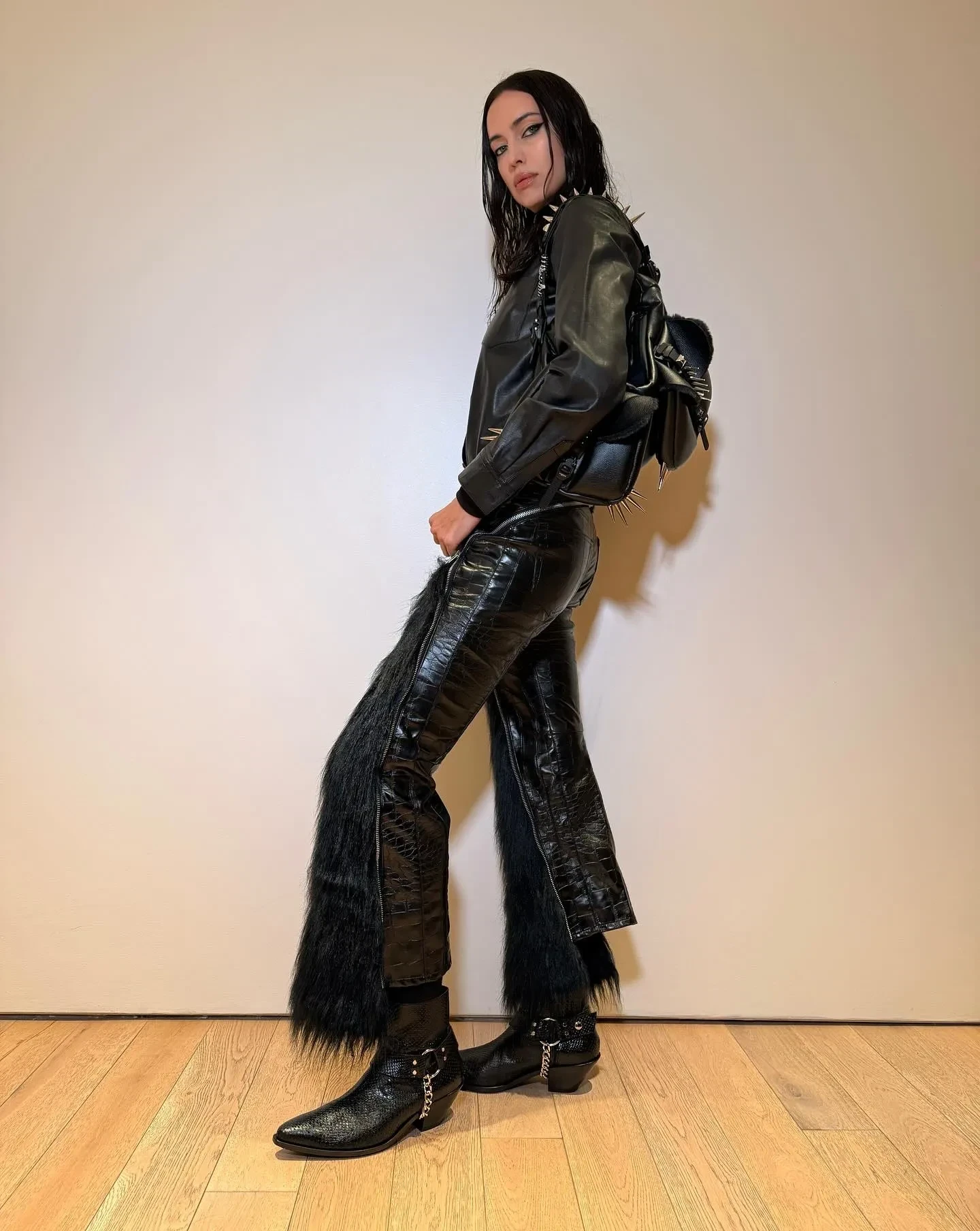 Для вечера Шейк выбрала образ total black: на ней была водолазка, кожаная рубашка и брюки с меховыми вставками. Образ модель завершила сумкой с шипами от Junya Watanabe x Inneraum, казаками и угольно-чёрными стрелками. "Вчера чествовали настоящего гения — Стивена Кляйна. Для меня огромная честь быть частью твоего мира и этого невероятного проекта. Столько любви, столько магии", — написала Ирина.