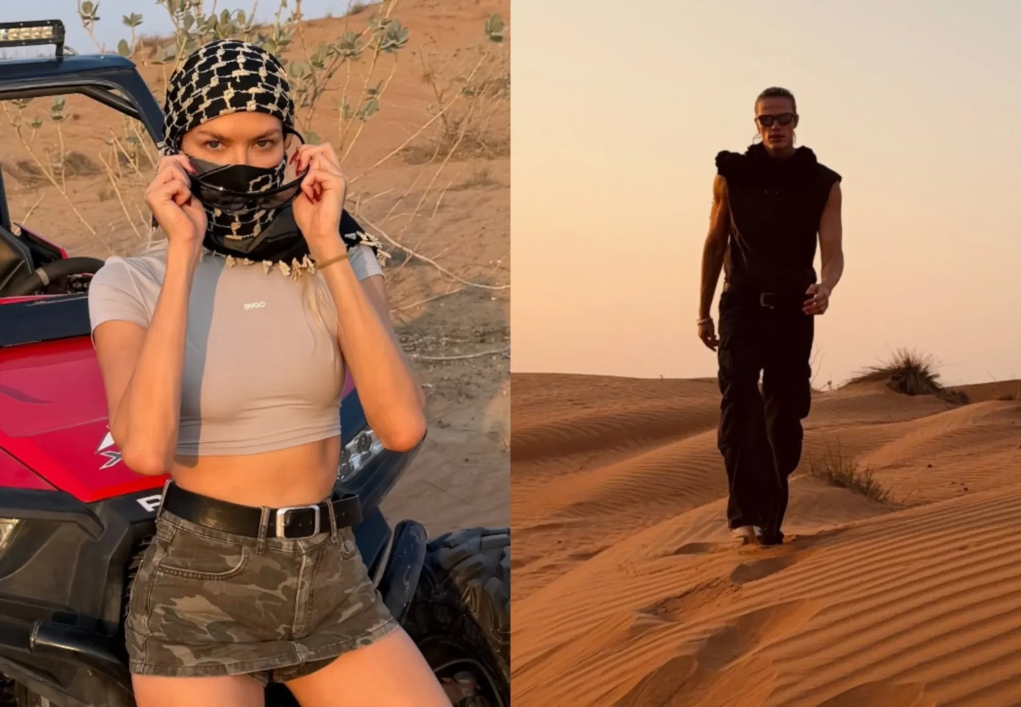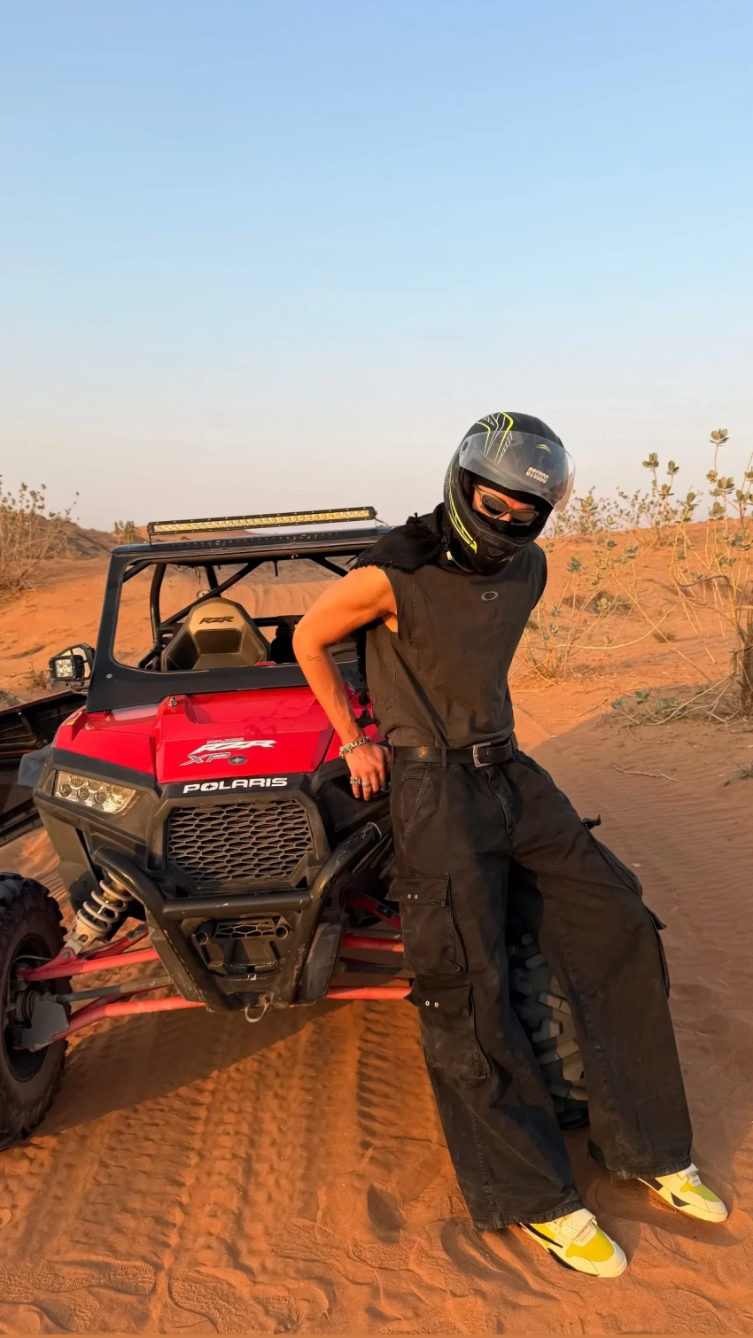 Похоже, влюблённые поселились в домике прямо в пустыне. Они сразу отправились рассекать по дюнам на багги и встречать закат. Чтобы прочувствовать местную атмосферу, Перминова также сделала роспись мехенди.