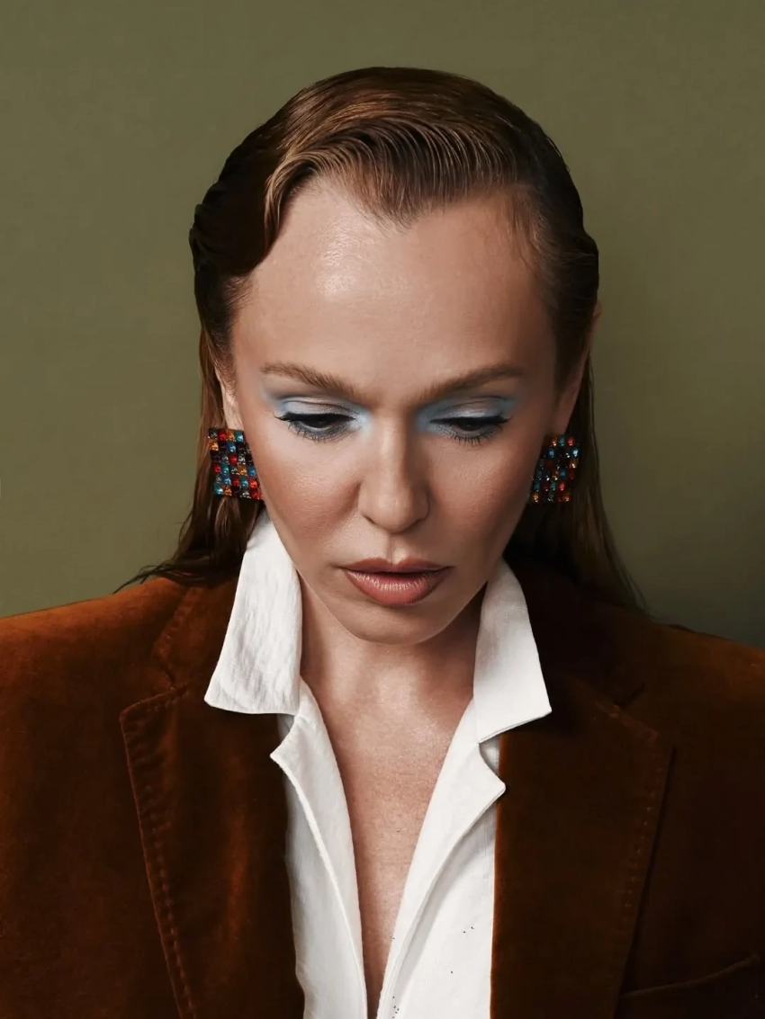 На снимках она предстала в чёрных микрошортах, белой блузке, коричневом пиджаке и коричневых сапогах, а также с ярким мейком авторства Станислава Кремлёва. В качестве фотографа выступила Дарья Морозова.