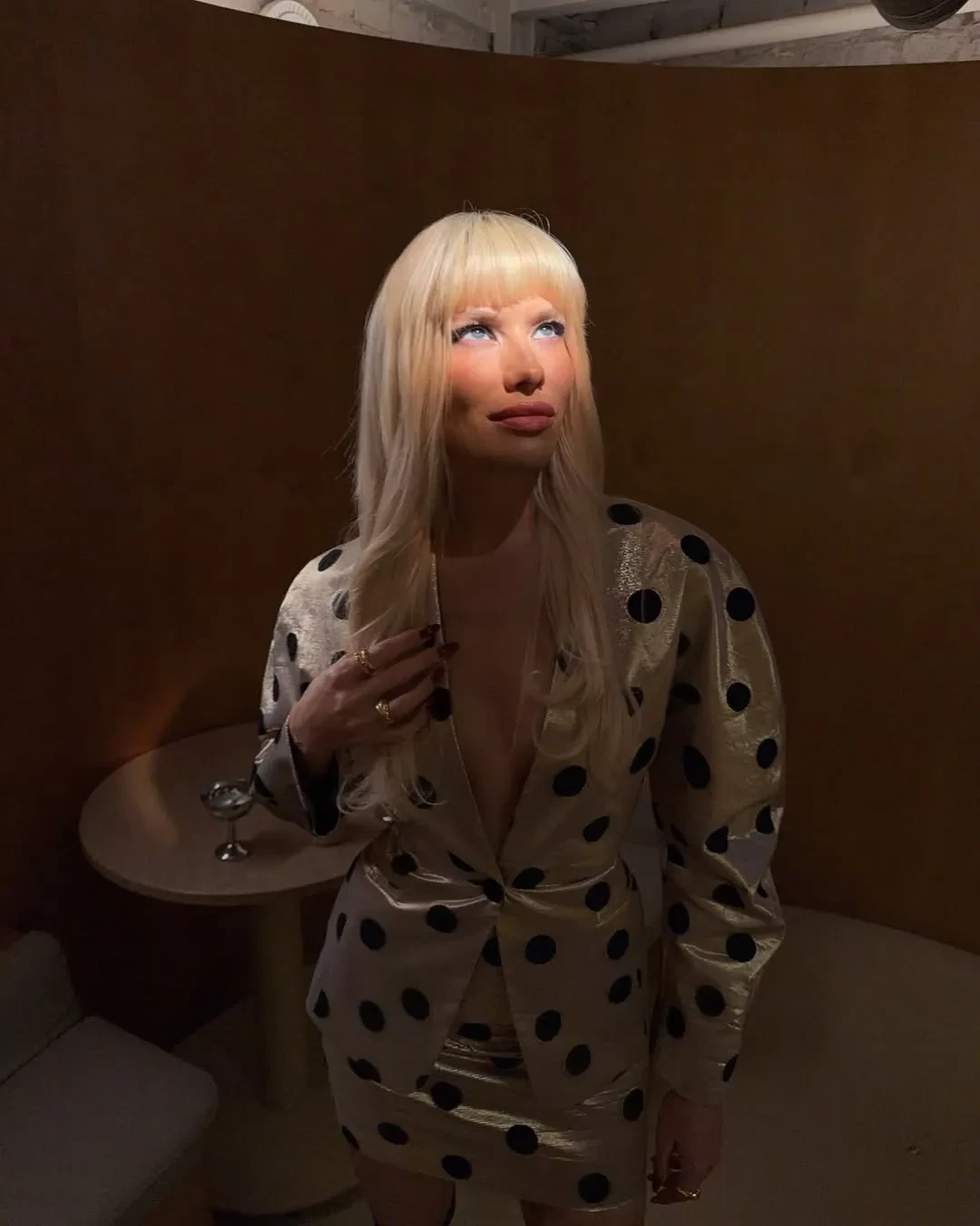 На снимках Перминова позирует в костюме в горох с мини-юбкой российского бренда Selfmade и ботфортах-чулках Blumarine. Образ дополнила укладка с чёлкой — вероятно, накладной.