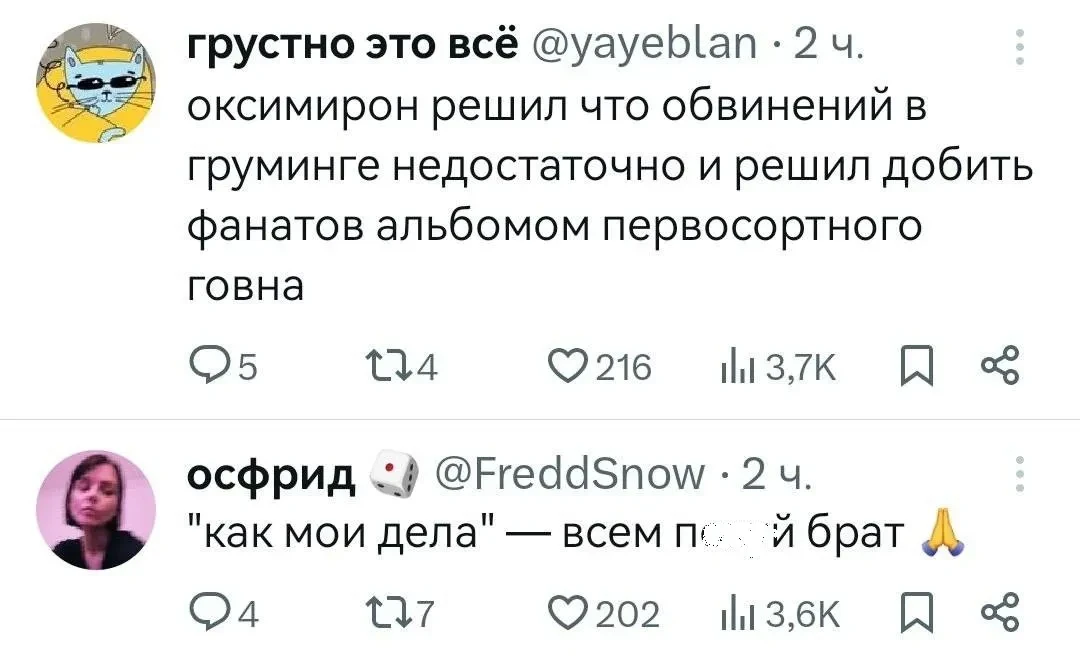 Однако в марте журналистка Анастасия Красильникова выпустила эпизод подкаста "Дочь разбойника", в котором несколько фанаток Оксимирона* обвинили его в груминге, растлении и сексуализированном насилии в то время, когда они были несовершеннолетними. Оксимирон* развёрнуто не комментировал скандал, но написал в соцсетях, что с одной из предполагаемых жертв у него "была сложная и травматичная для обоих история" и он "берёт ответственность за свои поступки".