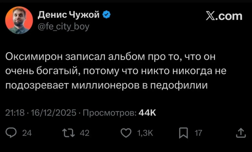 Скриншот из соцсетейНапомним, в ноябре 2024 года Оксимирон* (Oxxxymiron* — настоящее имя Мирон Фёдоров*) объявил об отмене всех запланированных концертов, сославшись на проблемы со здоровьем. Тогда в сети возникли слухи о том, что рэпер тяжело болен.