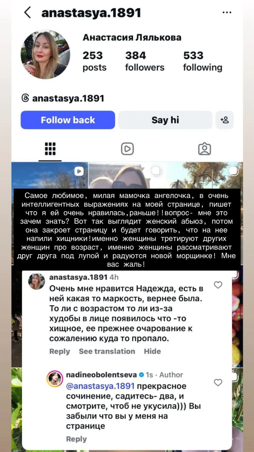 Сторис* Надежды ОболенцевойСитуация сильно возмутила светскую львицу. В сторис* она вынесла произошедшее на публику и заявила, что главный критик женщины — другая женщина: "Самое любимое — милая мамочка ангелочка в очень интеллигентных выражениях пишет на моей странице, что я ей очень нравилась раньше! Вопрос: мне это зачем знать? Вот так выглядит женский абьюз. Потом она закроет страницу и будет говорить, что на неё напали хищники! Именно женщины третируют других женщин из-за возраста, именно женщины разглядывают друг друга под лупой и радуются новой морщинке! Мне вас жаль!".