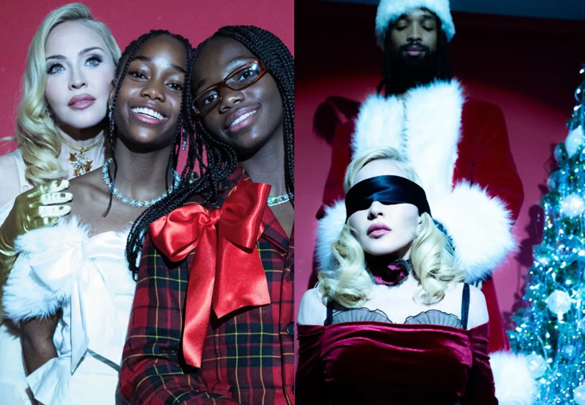 Мадонна опубликовала в своём инстаграме* снимки с новой фотосессии, в которой попозировала в нижнем белье у новогодней ёлки с молодым бойфрендом Акимом Моррисом и двумя своими приёмными дочерьми.