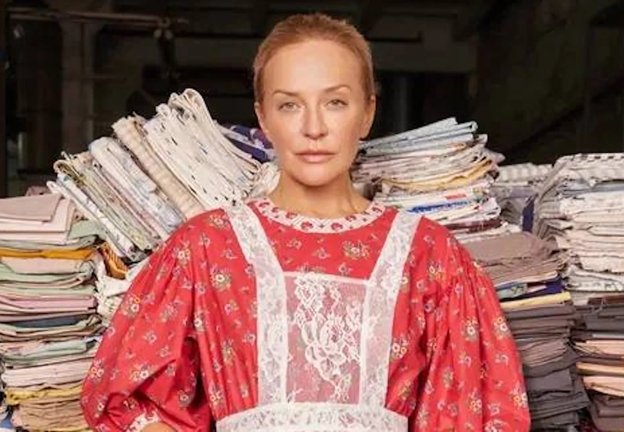 Шелягова примерила фартуки, платья и сарафаны с уникальными принтами, которые были специально отобраны и воссозданы художниками Шуйской фабрики по архивным образцам XVIII—XIX веков и перенесены на современный ситец.