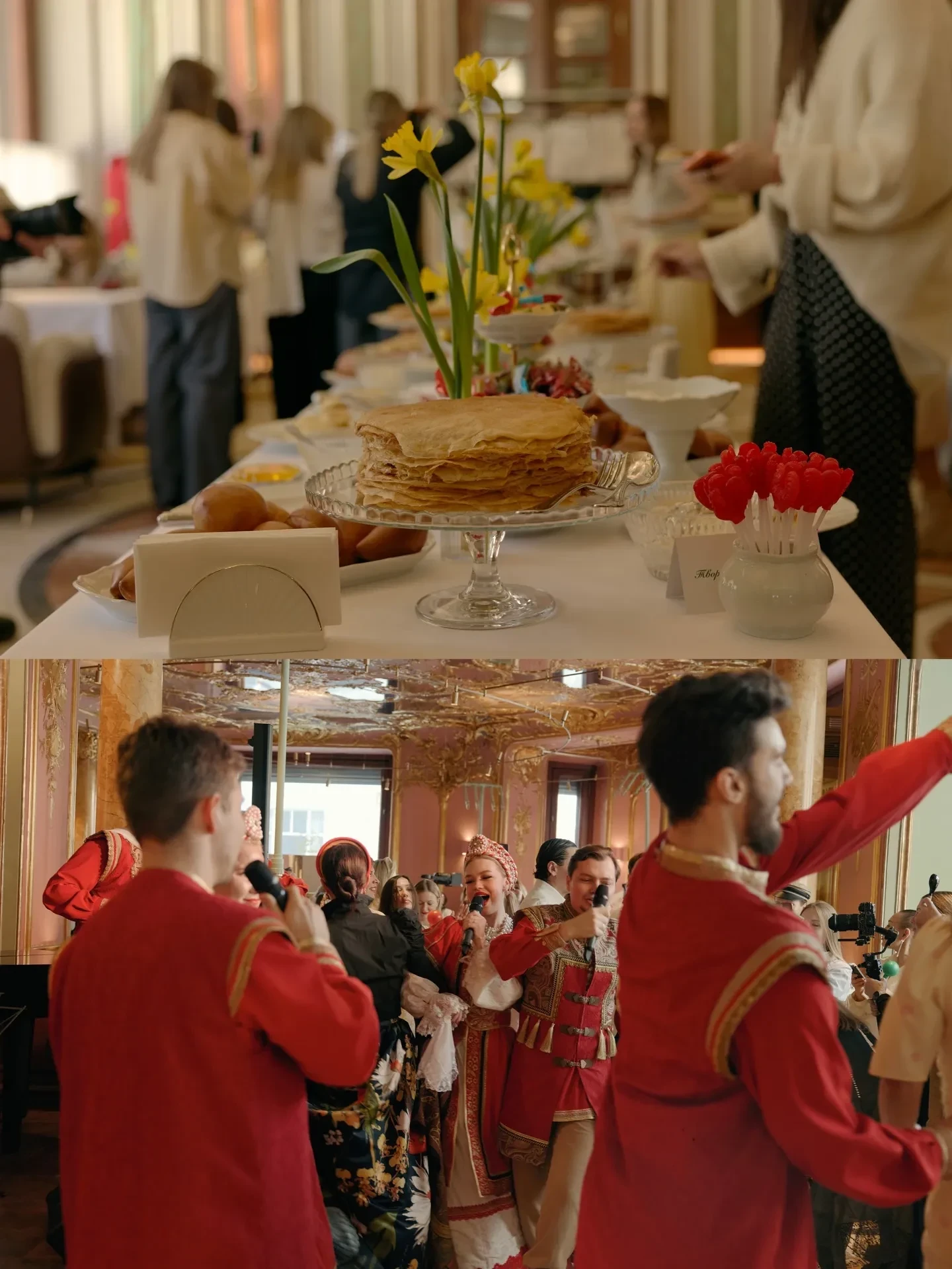 Праздничным дресс-кодом стали образы в жёлто-белой цветовой гамме, напоминающей о нарциссах, которыми было украшено всё пространство. Столы ломились от угощений: наряду с традиционными блинами и оладьями присутствующих угощали пирожками с мясом и капустой, соленьями, шоколадными конфетами и петушками на палочке, которые предлагали запивать травяным чаем и настойками.