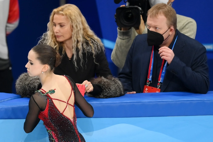Камила Валиева, Этери Тутберидзе и Сергей Дудаков на Олимпиаде в Пекине
