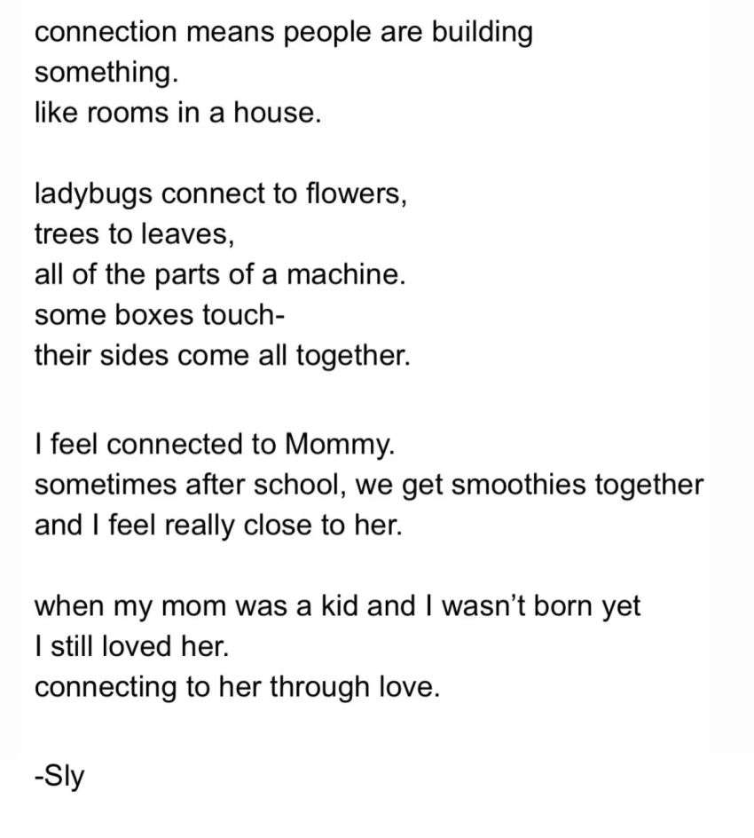 "Связь означает, что люди что-то создают. Например, комнаты в доме. У божьих коровок есть связь с цветами, у деревьев — с листьями. Всё это части одной системы. Некоторые коробки соприкасаются, и их стороны идеально совпадают. Я чувствую связь с мамой. Иногда после школы мы вместе идём пить смузи, и я ощущаю близость с ней. Когда моя мама была ребёнком, а я ещё не родился, я уже любил её. Связываясь с ней через любовь".