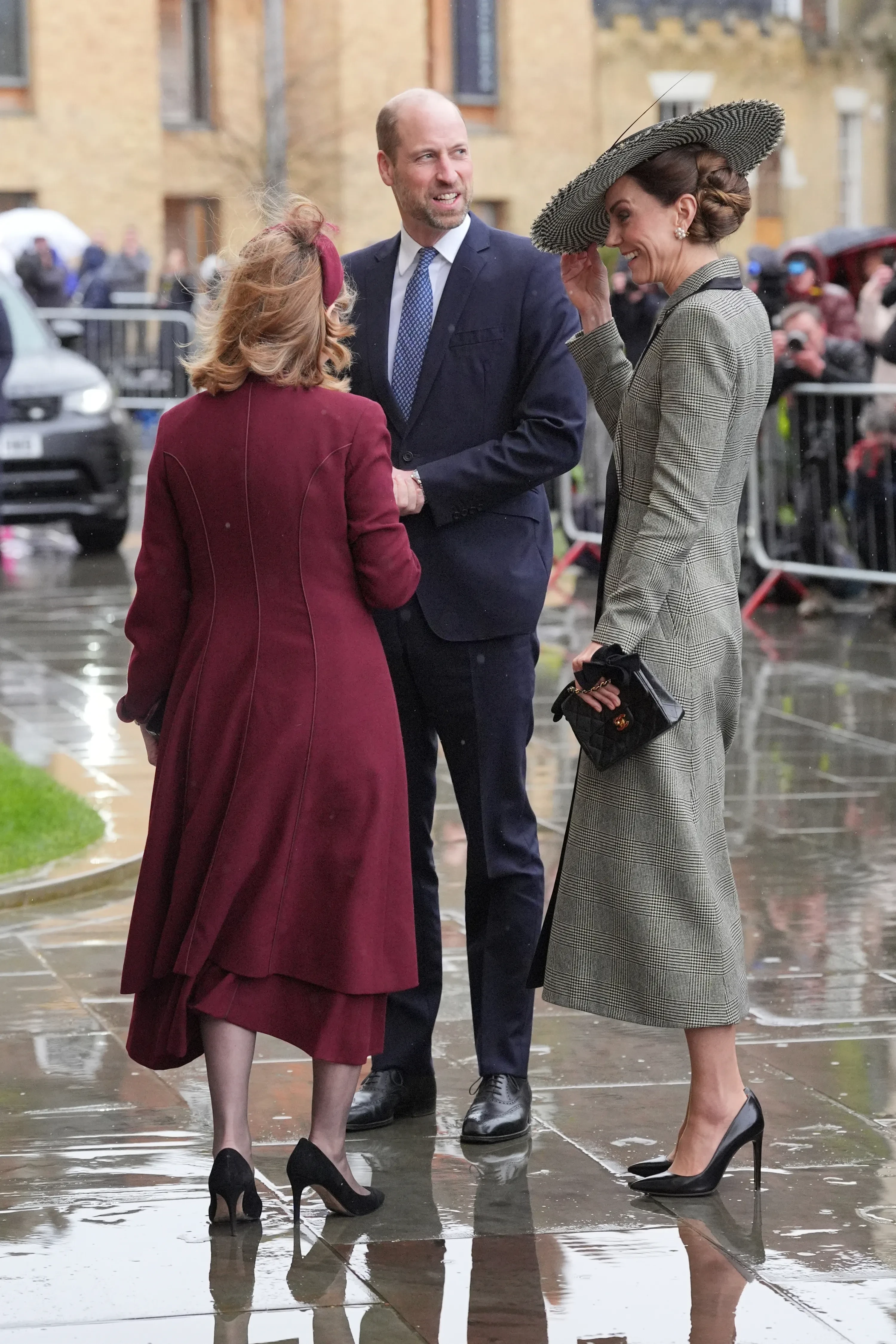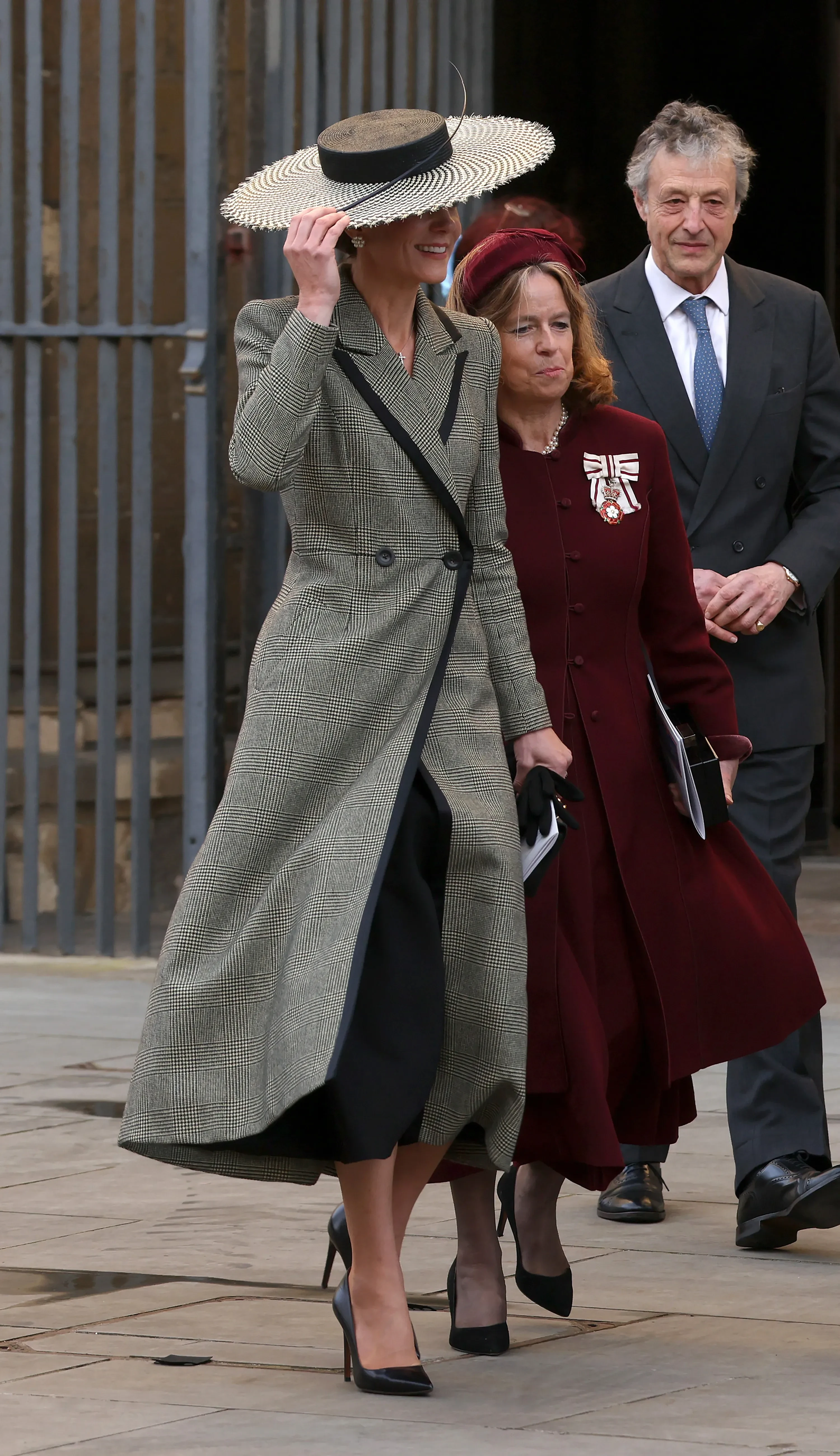 Образ, в котором принцесса прибыла в Кентерберийский собор, не оставил никого равнодушным: она была в сером клетчатом платье-пальто Suzannah London и на высоких шпильках. Наряд Кейт завершали жемчужные серьги в виде цветков и классическая сумочка от Chanel, но главным элементом выступила широкополая шляпа от английского бренда Juliette Millinery. Головной убор, который многие сравнили с фирменными шляпками первой леди США Мелании Трамп, практически полностью скрывал лицо Миддлтон и из-за сильного ветра то и дело норовил улететь — принцессе приходилось его придерживать.