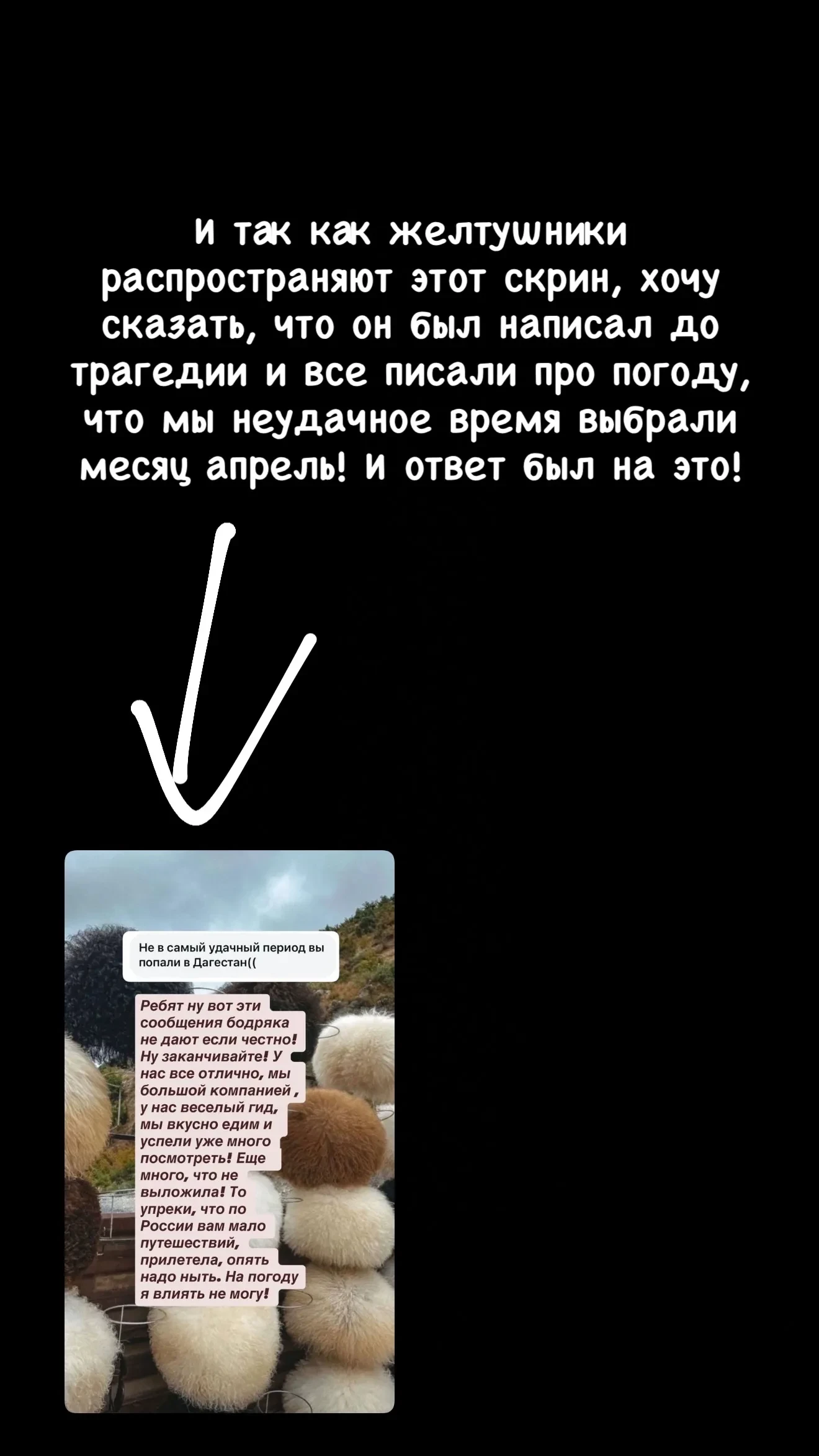 Впрочем, позже Ксения Бородина объяснила, что скандальный пост был опубликован ещё до ухудшения ситуации и стал ответом подписчикам, критиковавшим выбор времени для поездки. Телеведущая выразила соболезнования семьям погибших и пообещала организовать гуманитарную помощь.