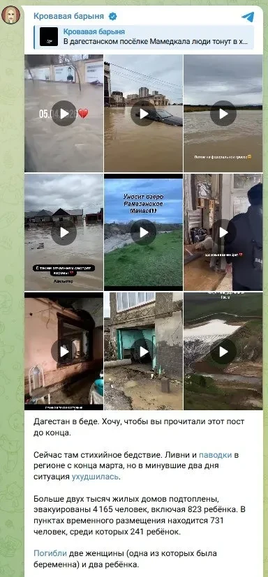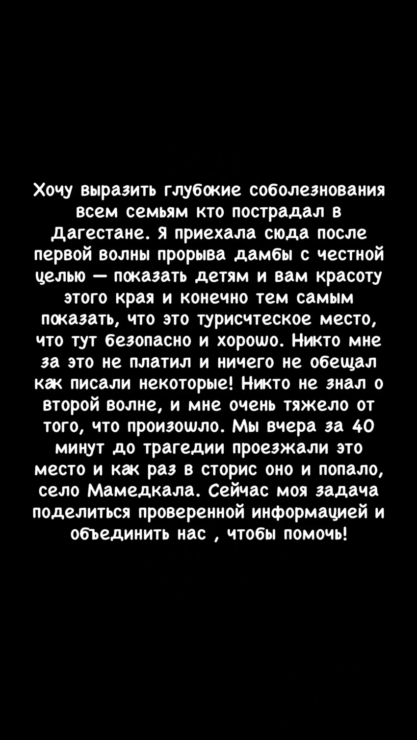 "Дагестан в беде. Сейчас там стихийное бедствие. Ливни и паводки в регионе с конца марта, но в минувшие два дня ситуация ухудшилась. В пунктах временного размещения находится 731 человек, среди которых 241 ребёнок. Погибли две женщины (одна из которых была беременна) и два ребёнка. Никогда не спрашивай, по ком звонит колокол — он звонит по тебе, по мне, по каждому из нас. Наши люди в беде — и их нельзя оставлять там в одиночестве".