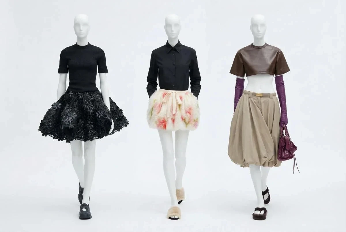 Один из самых заметных силуэтов сезона — юбка-баллон. Ее объемная форма создает выразительный и немного скульптурный образ.